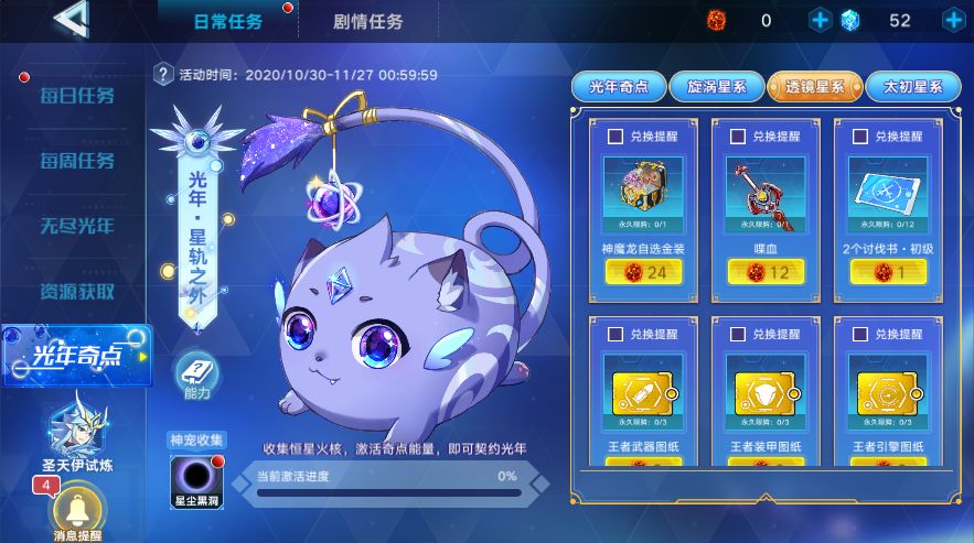 活动内容:透镜星系奖励兑换开启!精美手持时装[喋血]、神魔龙自选金装等一系列珍贵奖励等你兑换。快去收集恒星火核,把所需资源搬回家吧!