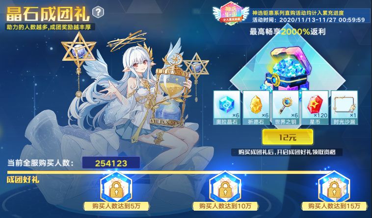 活动内容:超值限定晶石成团礼来临,仅限购买一次。入手晶石成团礼包后,即可免费领取进度豪礼,随着购买人数增多,达到对应进度后即可领取更多更丰厚的进度奖励哟!本次晶石成团礼新增洛羲主题聊天气泡奖励,早买早享受!(温馨提示:购买晶石成团礼将计入累充进度)