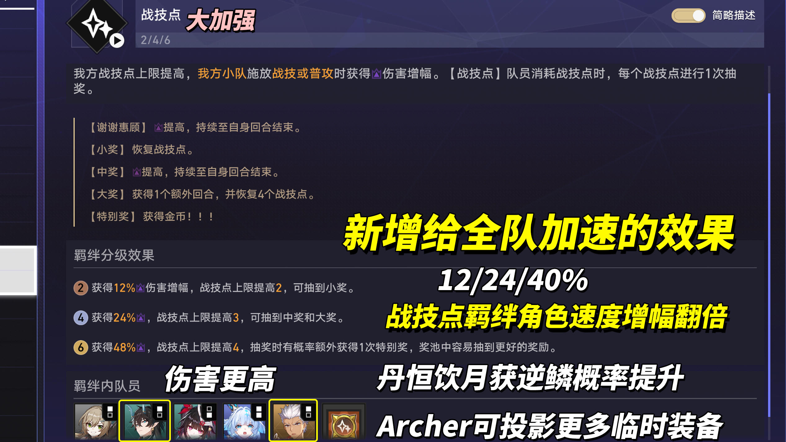 「战技点」新增为全队提供12/24/40%速度的效果,并且战技点角色可获得2倍速度增幅。