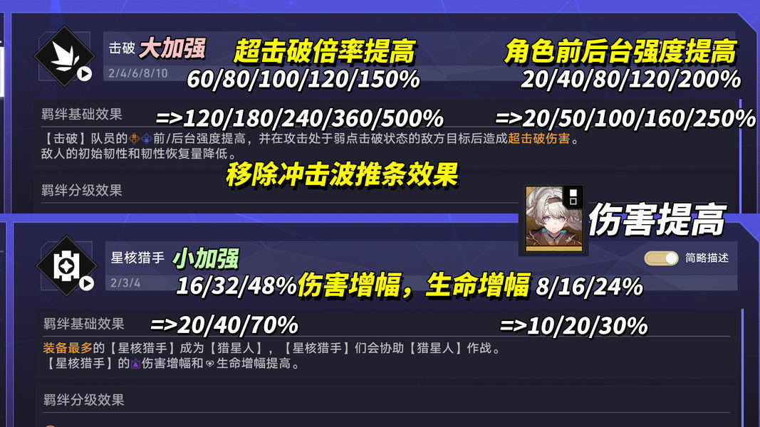 「击破」提供的超击破倍率60/80/100/120/150%=>120/180/240/360/500%,并移除冲击波的延后效果。角色前后台强度20/40/80/120/200%=>20/50/100/160/250%。