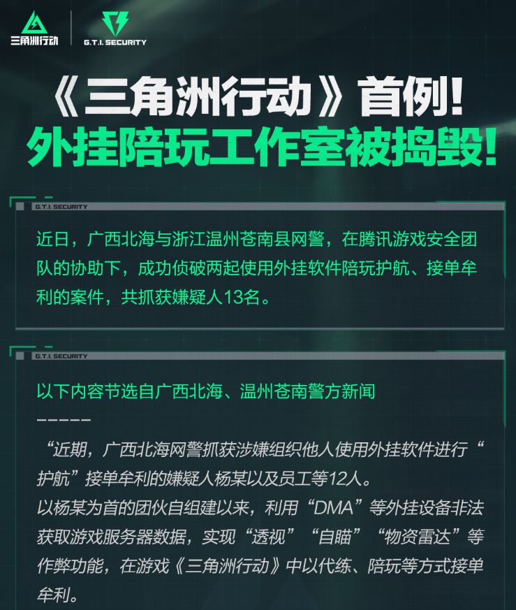 《三角洲行动》官方近日发布公告,宣布腾讯游戏安全团队协助广西北海、浙江温州两地网警,成功捣毁当地非法外挂护航工作室,涉案的多名嫌疑人已全部抓获,案件相关调查正在推进中。
