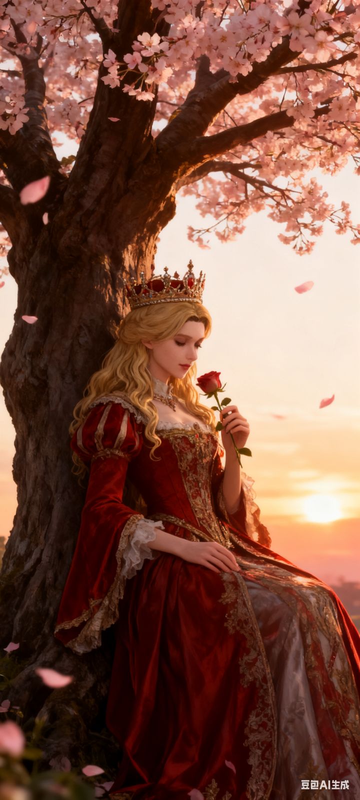 以图中人物为主体,图中人物的剪影,保持头饰与发型服装不变,倚靠在一颗巨大的樱花树下,右手持一朵玫瑰,低头闻着玫瑰花香,电影级光影效果,逆光。黄昏。场景中有些许零散的粉色花瓣飘落,浪漫氛围,极致细节。