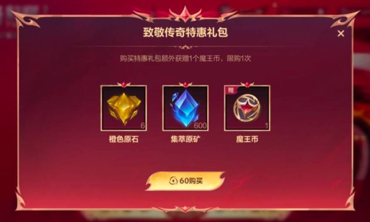 12月15日(明日)-2026年1月14日活动期间,召唤师花费60点券即可购买致敬传奇特惠礼包,限购1次,礼包包含魔王币*1、橙色原石*6、集萃原矿*600。
