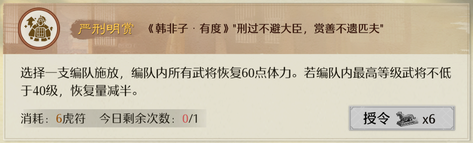 开荒期,你可使用「严刑明赏」恢复编队武将的体力,用来打地、练级。