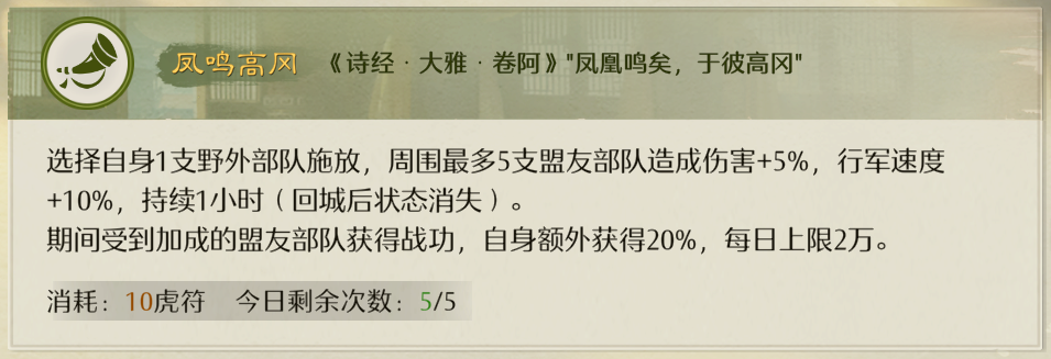 团战点开「凤鸣高冈」,则可化身团战光环,给周围5支盟友部队提供伤害与移速加成。