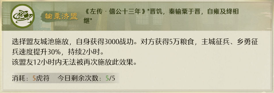 「输粟济盟」不仅能为盟友快速提供粮食补给,还能增加其征兵速度。
