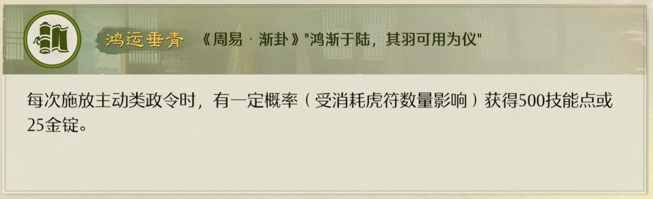 衡道每次主动释放政令,都有概率获取金锭或技能点奖励,既能帮助盟友,又能获得意外之喜。