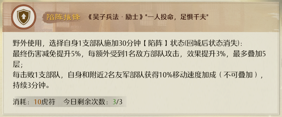 核心政令「陷阵摧锋」发动后,可获得集火减伤、杀敌加速的增益效果,在战场上愈战愈勇。
