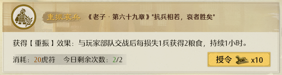 配合「重振哀兵」政令,可抵消死兵率提升带来的副作用,将兵损转化为粮食,用于生产下一波预备兵。