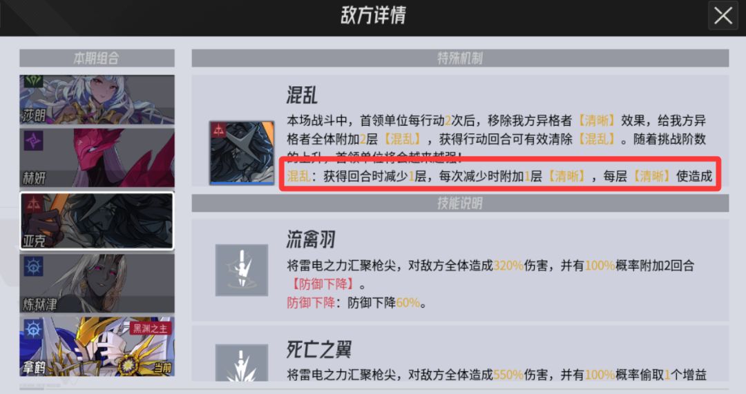 👀【亚克】获得回合时移除一层【混乱】并附加一层【清晰】的效果,每层增伤50%,满层增伤100%,没记错应该是这样