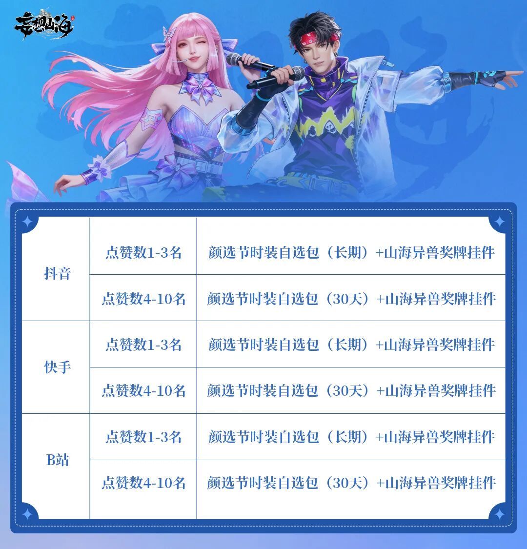 限时活动期间,在抖音、B站、快手平台,带#妄想山海颜选节#标签,发布本人原创展示视频(可以是真人、才艺、宠物、游戏角色展示等,但纯活动介绍、攻略类除外),视频内容需与颜选节相关且有游戏角色昵称/id露出,即可参与颜选节视频平台分会场的选拔,活动结束后,我们会根据作品在视频平台的数据,评选出分会场的奖项并发放奖励!