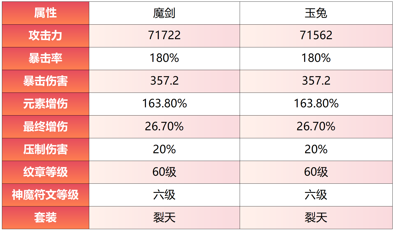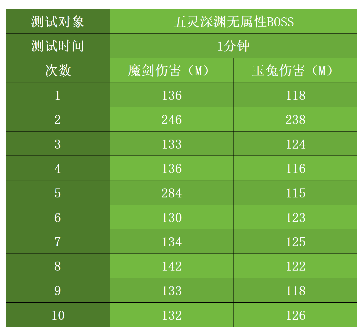测试结果:玉兔定位为辅助,和主流输出相比伤害要稍逊一筹,但是作为流血唯一限定英雄,伤害表现比起其余非输出型功能性限定角色还是要强上几分的,并且玉兔的加入,能更进一步强化魔剑的输出,值得培养。