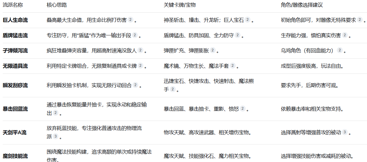 流派选择建议:对于新手,巨人生命流和天剑平A流构筑简单,前期强度有保障,非常适合开荒。在熟悉游戏后,可以尝试更具操作感和想象力的无限道具流或瞬发流,体验“为所欲为”的快乐。