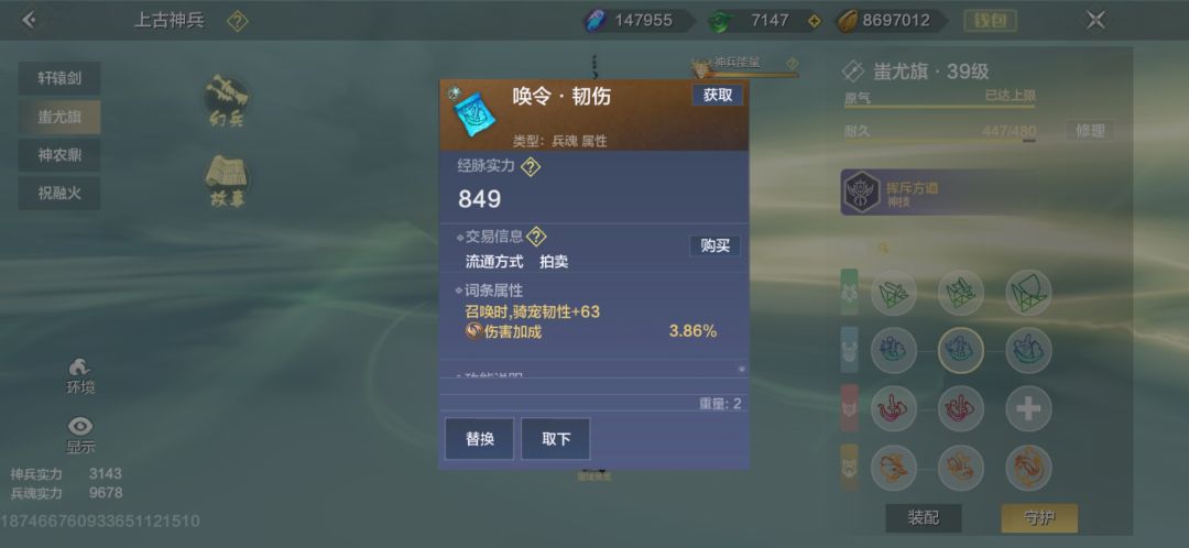 兵魂唤令·韧伤,蚩尤伤加兵魂,4.0以上能买大几百,跨服拍卖(200-1000勾)