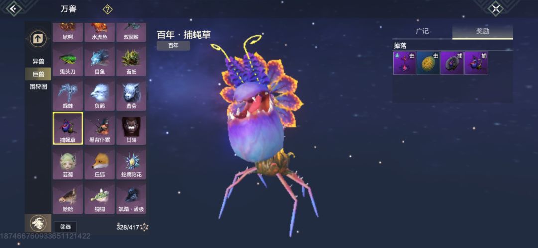 12.百年·捕蝇草,稀有度烂大街,建议击杀,出,必出异兽元胎(蓝色元胎或紫色元胎)和捕蝇草(需要种植的捕兽夹,只能抓临时),三山皆有刷新。