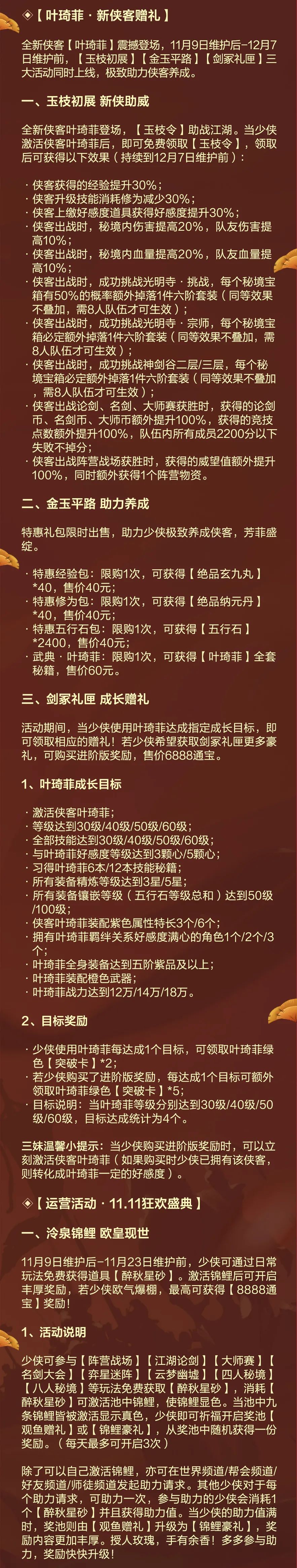 今日更新后,登录完成叶琦菲【玉枝将绽】活动,即可领取全新侠客【叶琦菲】及超多好礼。