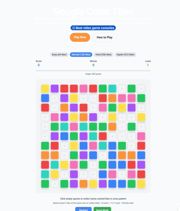 Play Google Color Tiles and other colorful puzzle games online. Free color matching and tile elimination games for all ages.