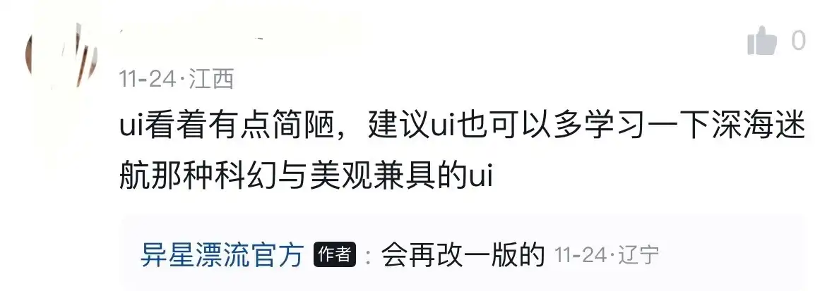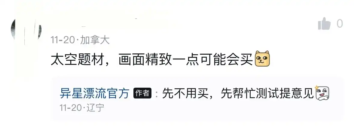 3.玩家C随口一提:“画面不够炫啊,能加个闪亮的灯球吗(不是)”异星漂流回复:改改改,会改的!!办公室里美术正当场抱着屏幕流泪努力修改ing!!