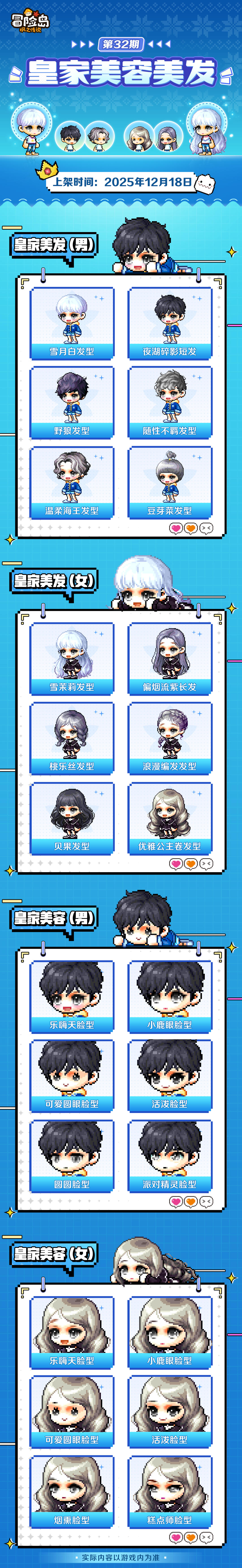 本期惊喜上架「夜湖碎影短发」「随性不羁发型」冒险岛酷guy登场!还有「雪茉莉发型」「优雅公主卷发型」甜美大小姐驾到。多款可爱活泼的脸型也融化了小岛的冬天~