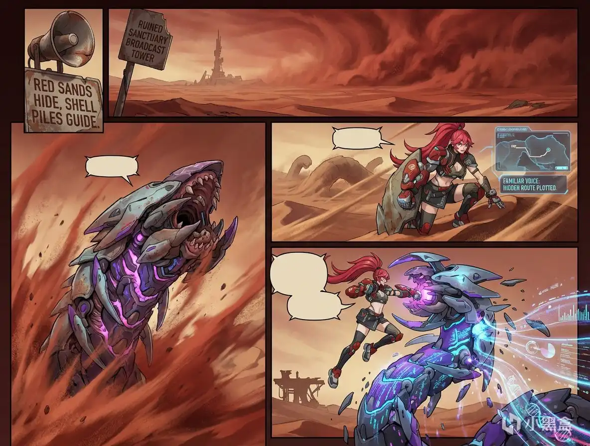 熟悉的声音:前往避难所中心区,将这一区域的母巢神经网的中枢摧毁,我检测到中心区附近存在高能反应,小心。我这边得抓紧检索路线,沙尘暴快把死亡沙漠裹住了,得找条安全的路穿过去。