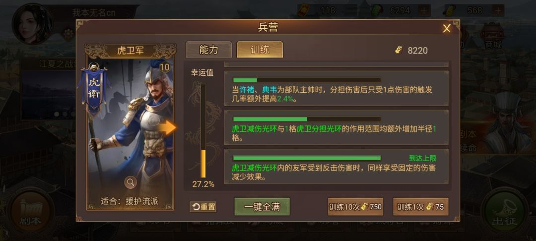 虎卫主要要的是减伤光环的范围,加1格就可以很好用了。主要作用是保护队友别被敌人突击和暴击打残。另外就是普攻触发大戟士援攻,以及偶尔奇袭一下敌人进树林的武将。