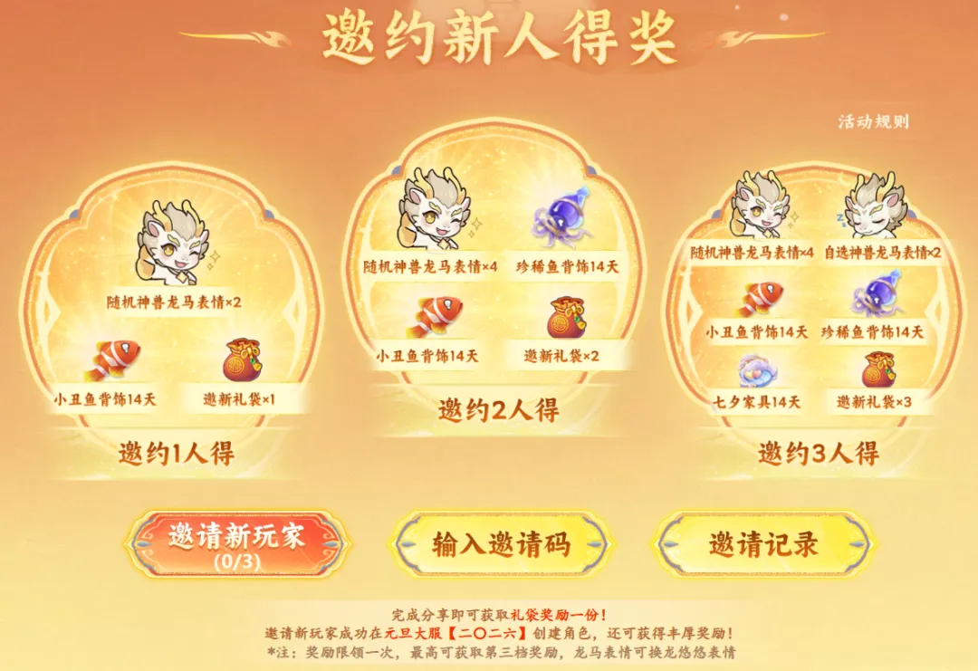 参与邀新有礼活动,邀请新玩家在大服完成预创建,即可获得邀新礼袋、限时珍稀鱼背饰、限时情缘家具、神兽龙马表情等好礼!