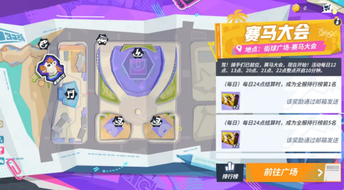 其实是派对把赛马场搬进了街球广场,你不光能用这些个性十足的小马来一场约老师最爱的[赛马大会],还有让你足够有面儿的豪华[花车巡游]、把广场变成音乐节的[街头奏乐]等等玩法上新!快跟上米宝一起逛逛街球广场的新花样!