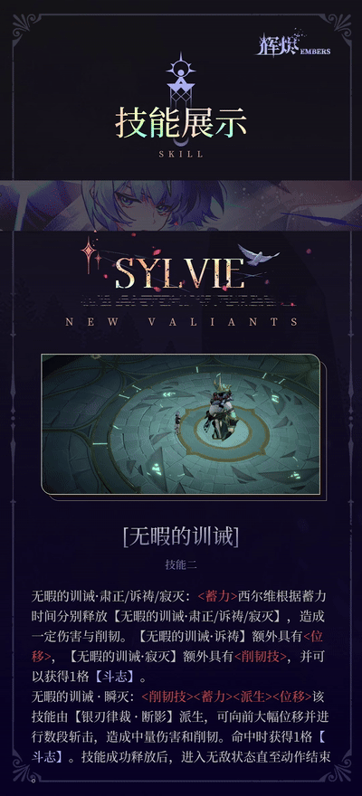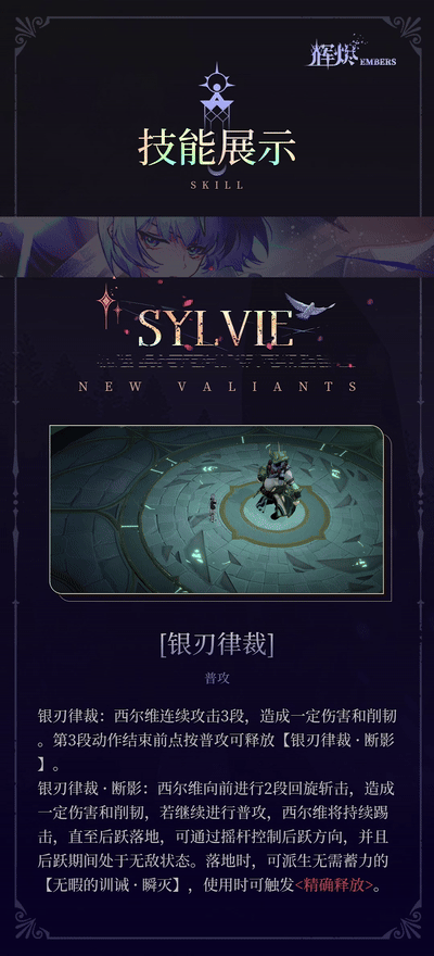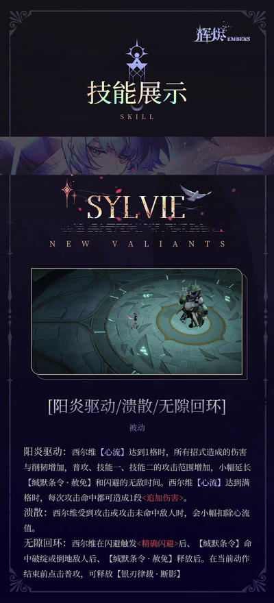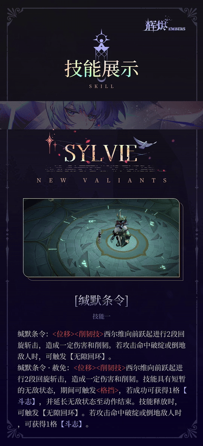 西尔维从小接受严格的“阴影之道”训练,精通暗杀技巧、情报搜集以及心理操控能力。她被视为家族百年难得一遇的天才,受到父亲阿尔诺·德·拉罗什的重点培养。然而,在一次针对辉烬结社的秘密行动中,她的父亲不幸丧生,不久后母亲也在绝望中自缢而亡。她很清楚这是辉烬结社与议会某些高层相勾结,特地给她父亲设下的局。拉罗什家族知道太多机密,很难不成为众矢之的。这场悲剧让年轻的西尔维被迫提前承担起家族的责任,同时也让她对议会腐败体制充满愤怒。