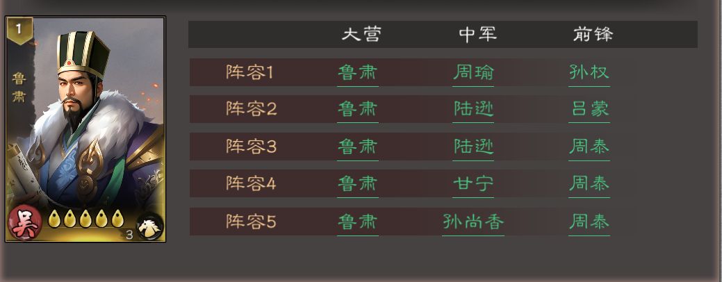 1. 阵容1:大营鲁肃 + 中军周瑜 + 前锋孙权