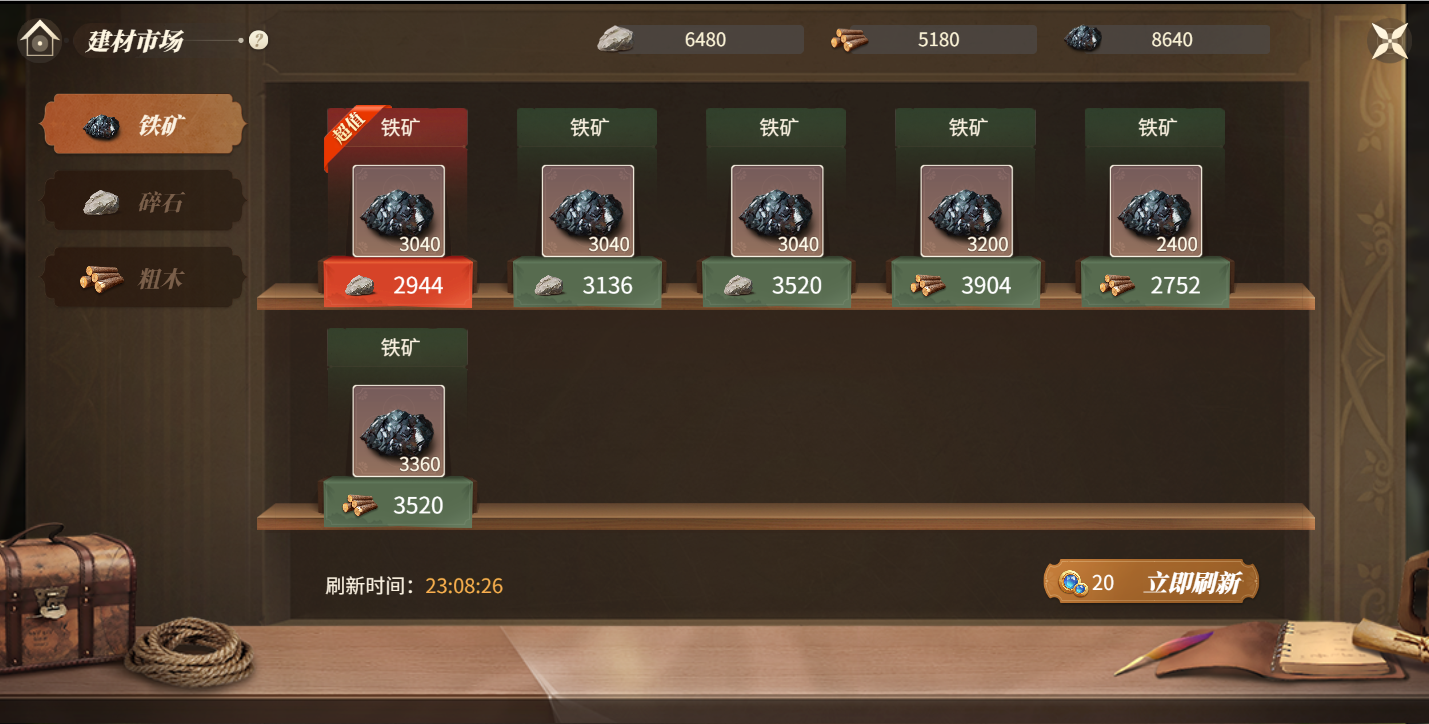 1.新增建材市场(支持铁矿石、木材、石头材料互换功能)