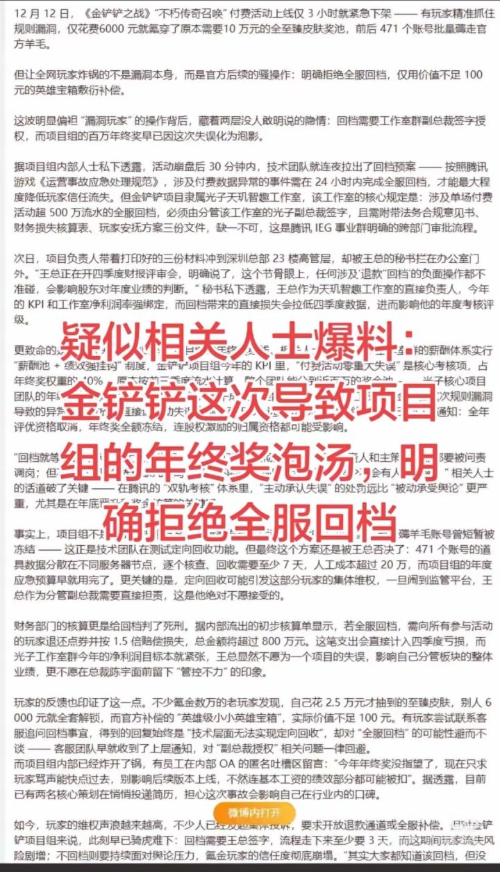 但时值四季度财报关键期,分管高管因担忧影响利润数据与个人KPI,最终否决回档方案,仅用价值不到100的英雄宝箱敷衍补偿。同时,项目组因活动失误率超标,已导致百万年终奖池被全额冻结,若公开回档承认失误,团队还将面临更严厉问责。