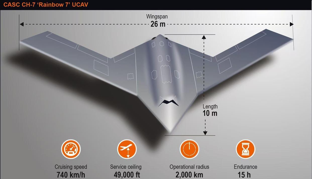 “彩虹-7”无人机展现了令人惊叹的隐身与飞行性能:其机身长约10米,翼展超过22米,采用独特的飞翼式布局,去除了垂直尾翼,将雷达反射截面积(RCS)降至极致,展现出“来无影、去无踪”的顶级隐身气魄。它最大起飞重量约13吨,巡航高度可达13000米,能够以0.75马赫的高亚音速巡航,确保了其能够快速抵达战区并对敌方纵深目标实施长时压制。
