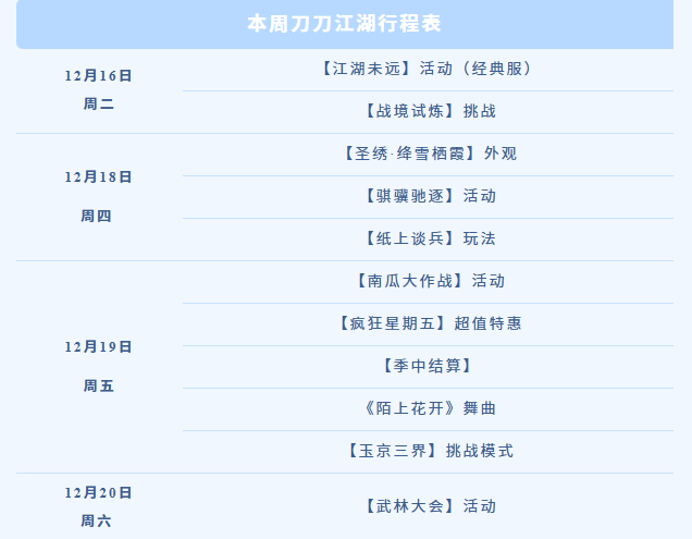12月16日-12月30日经典服少侠每日登录即可在【活动-江湖未远】中领取经典服成长礼盒,内含明月币、绑点等追赶好礼!