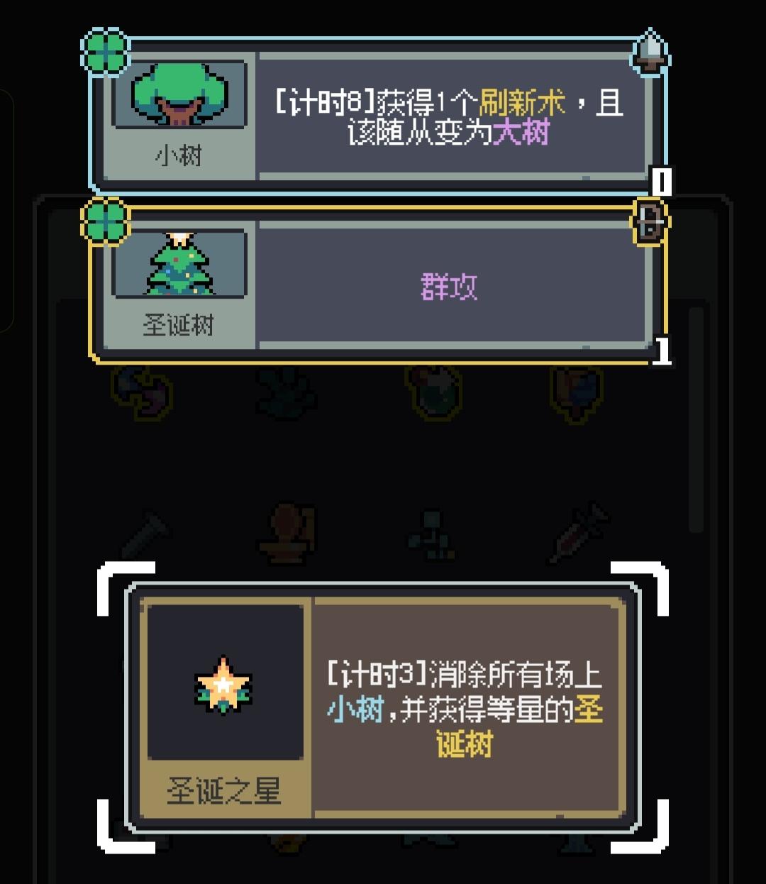 拿到圣诞之星后,刷出一个小树或者树苗,变形成圣诞树,基因窃取+群攻+连击,这时候就要尽量减少其他卡片了,可以用一些消除术把前期不用的卡给删掉,把舞台留给圣诞树。