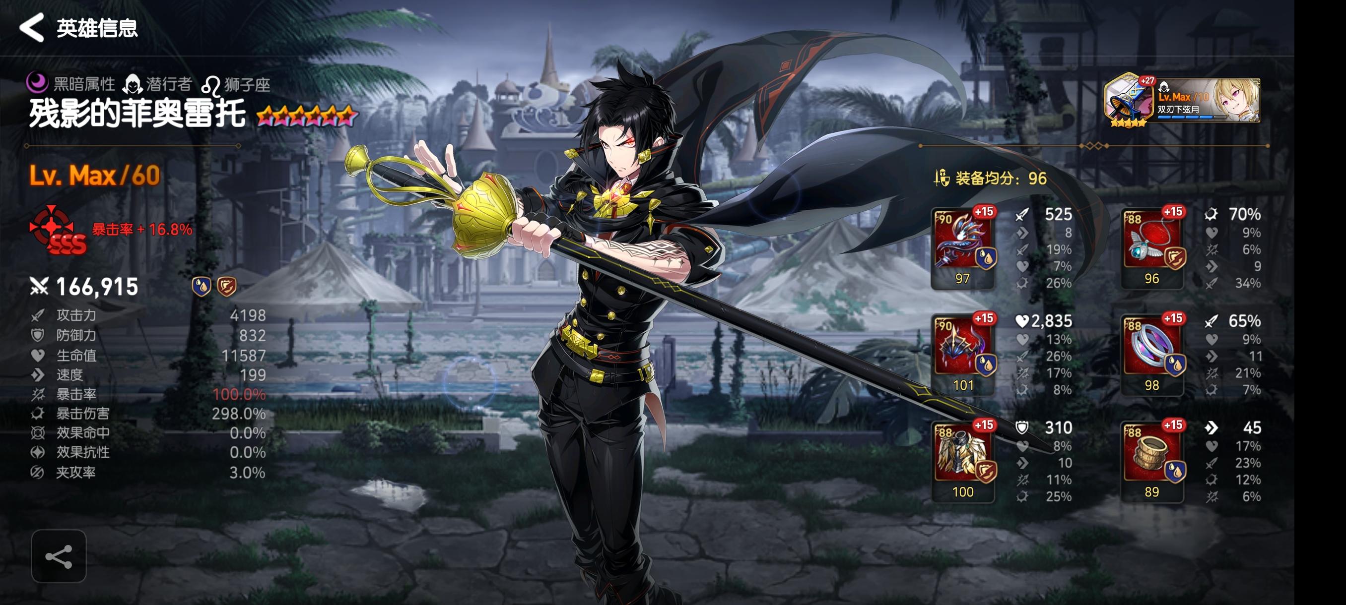 再比如说狮心王,他需要暴击爆伤防御,满暴击是前提防御和爆伤决定输出高低,生命保证生存,速度决定你对他的定位,那么右边三件套可以是暴击爆伤生命防御项链,生命防御戒指,生命防御速度鞋子,右边三件主属性是什么全看你对他的面板要求是什么,只要组合起来面板够就行,做高速的就速度套,沉底的就爆伤套,两件套可以选择撑面板(生命暴击)也可以选择加伤害(激流)