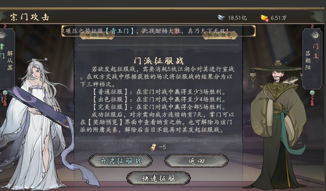 5.已完美征服的宗门将新增【快速征服】功能,点击后可立即完成征服并领取奖励;同时,战力低于该宗门的所有门派也将同步解锁此便捷选项。