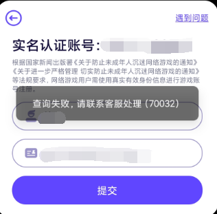(2)注册填写实名认证信息提示:查询失败请联系客服处理(70032)