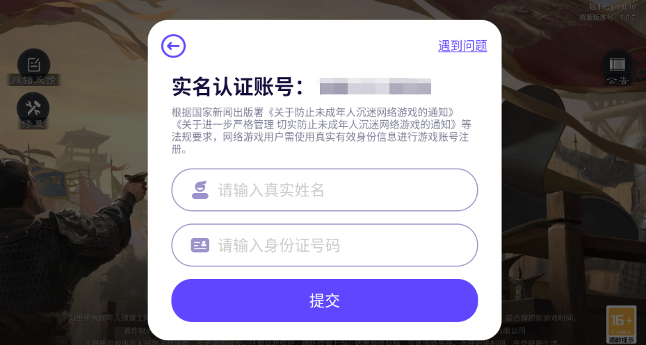 第一次账号完成登录后即进入实名认证步骤,按照有关部门要求,为保护未成年人健康成长,避免沉迷游戏,因此所有进入游戏的账号,必须进行实名后才能进入游戏。未完成实名认证的账号是无法体验游戏的,实名认证按照要求填写的信息填写完成即可,基本就是身份证和身份证号码,请如实填写个人真实信息,如果随便填写将无法完成实名认证,并且也不利于账号安全,还请大家务必留意重视;