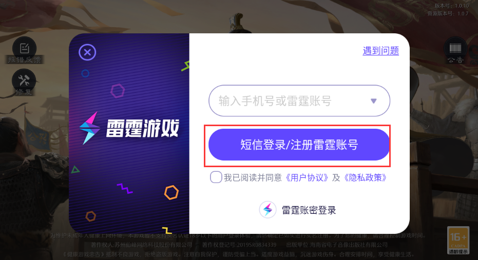游戏中注册账号:由于目前游戏新增了短信快捷登录方式,如果对应的手机号码之前并未注册过雷霆账号,属于第一次登录游戏,那么通过短信验证码登录游戏后即完成注册,并不需要单独再进行注册(登录界面并未提供单独的注册按钮的,请大家留意);