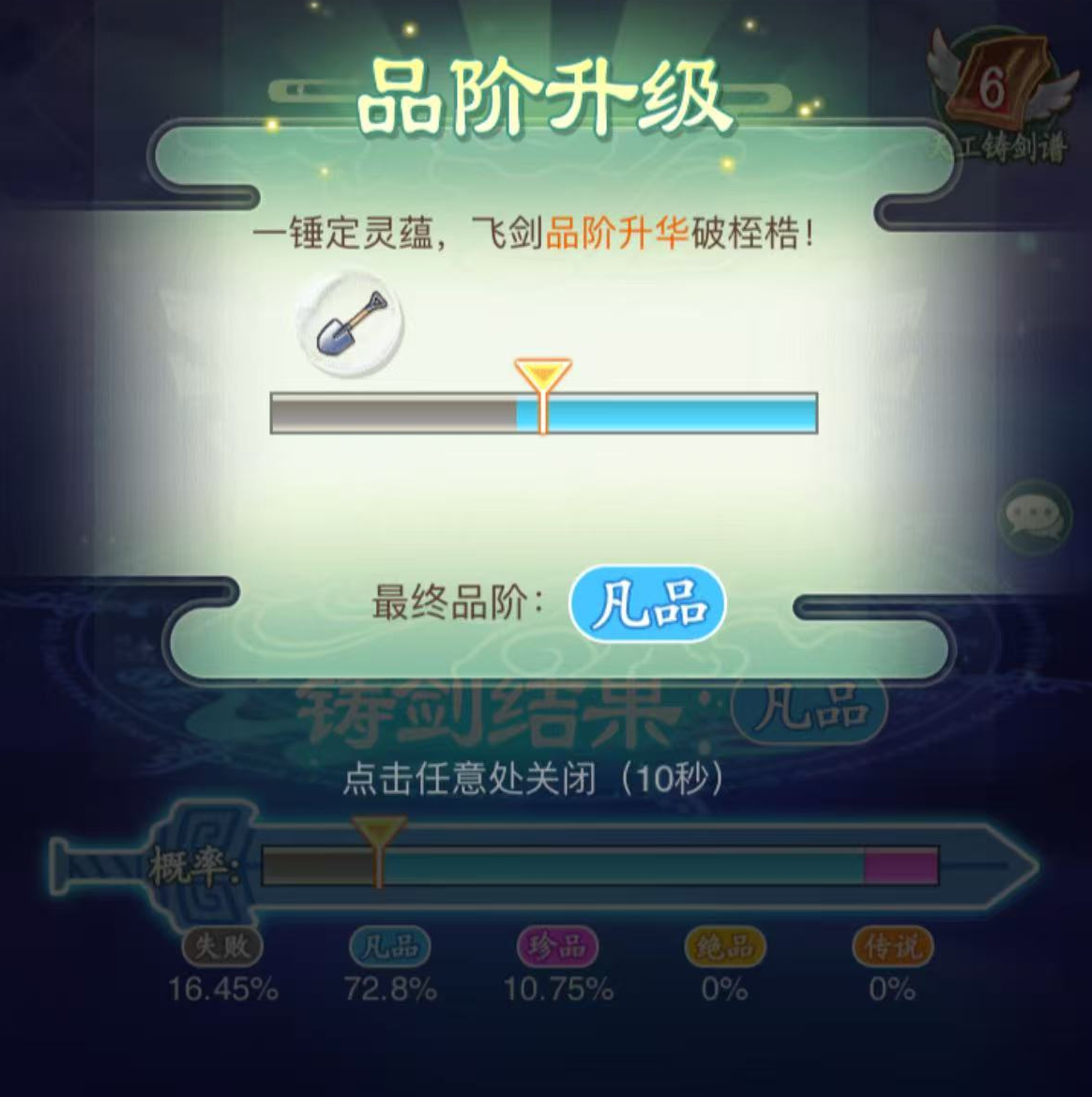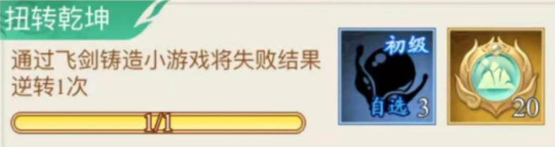 每次【铸剑】都有概率触发【逆转小游戏】,当落入灰色失败段落时,在小游戏中将飞剑铸造品级【失败】结果逆转为【凡品】飞剑。帮你保底获取,还能完成【扭转乾坤】隐藏,获取3个【自选低级飞剑铸造材料】。