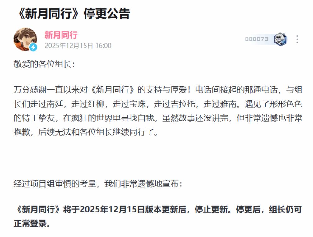 今日,国产二次元手游《新月同行》项目组发布公告,宣布经审慎考量,游戏将于2025年12月15日版本更新后正式停止后续内容更新。这款由烛薪网络研发的作品于2024年10月24日开启公测,运营时长仅一年多。