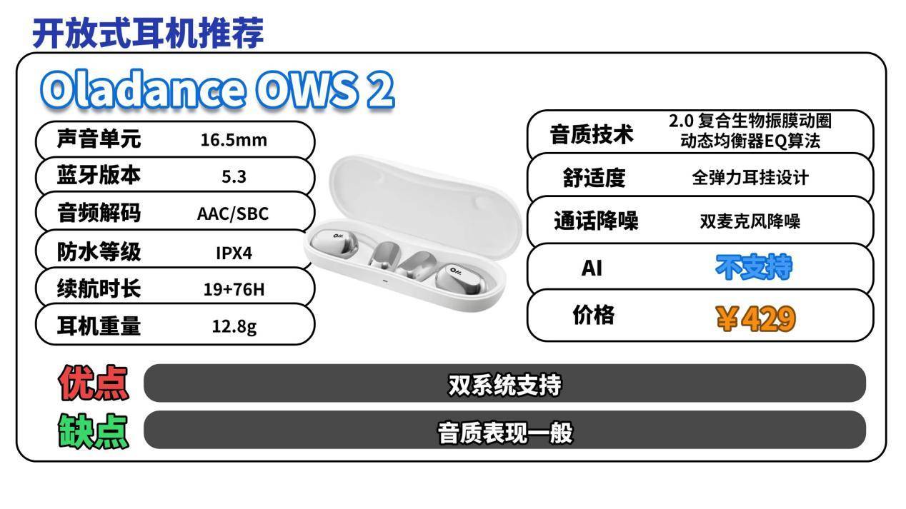 其他看点:搭配动态低频增强技术,配合创新空气声腔架构精密重和,扩大频响范围和提供更强的磁驱力,将声音细节层次清晰可辨,更将音质参数提升3倍,对于高品质追求的小伙伴是个不错的选择。支持蓝牙5.3版本,设备连接更加快速、高效,日常使用场景下延迟控制得当,而且支持双设备链接,手机通话、电脑办公自动切换接听设备。续航方面也还不错,单次满电续航10.5h,搭配充电盒可续航42h。开放式耳机推荐九: Ola dance OWS 2(¥429)综合推荐指数:⭐⭐⭐一句话推荐:智能算法低音补偿技术,自动校音,苹果安卓双系统支持核心看点:人体工学记忆钛合钢丝支架适配各种耳型,亲肤硅胶全覆盖耳挂,复合生物振膜动圈,更有低音算法补偿技术,自动校音。蓝牙5.3版本延迟更低,抗干扰能力更强。
