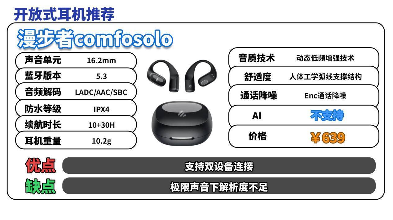 其他看点:科大讯飞Air 2配备18X11高分子跑道单元,让声音响应速度更快,声音层次更加清晰可辨。同时通过反相声波抵消技术,实时捕捉外溢声波,守护听音隐私。配置上支持蓝牙5.3版本,支持双设备蓝牙连接。更有自研viaim AI办公垂类大模式,录音转写、翻译交流等功能,大大提高工作效率,非常适合商务的小伙伴。同时在续航方面也还不错,单次续航可达19h,搭配充电仓可达53h长续航。开放式耳机推荐八: 漫 步者comfosolo(¥639)综合推荐指数:⭐⭐⭐一句话推荐:动态低频+创新声腔扩大频响范围,支持双设备连接自由切换核心看点:采用食品级液态硅胶优化机身重量配比,适配各种耳形,日常佩戴基本无问题。动态低频增强技术+创新空气声腔架构精密重合,扩大频响范围和提供更强的磁驱力,音质参数提升3倍,加强声音表达能力。