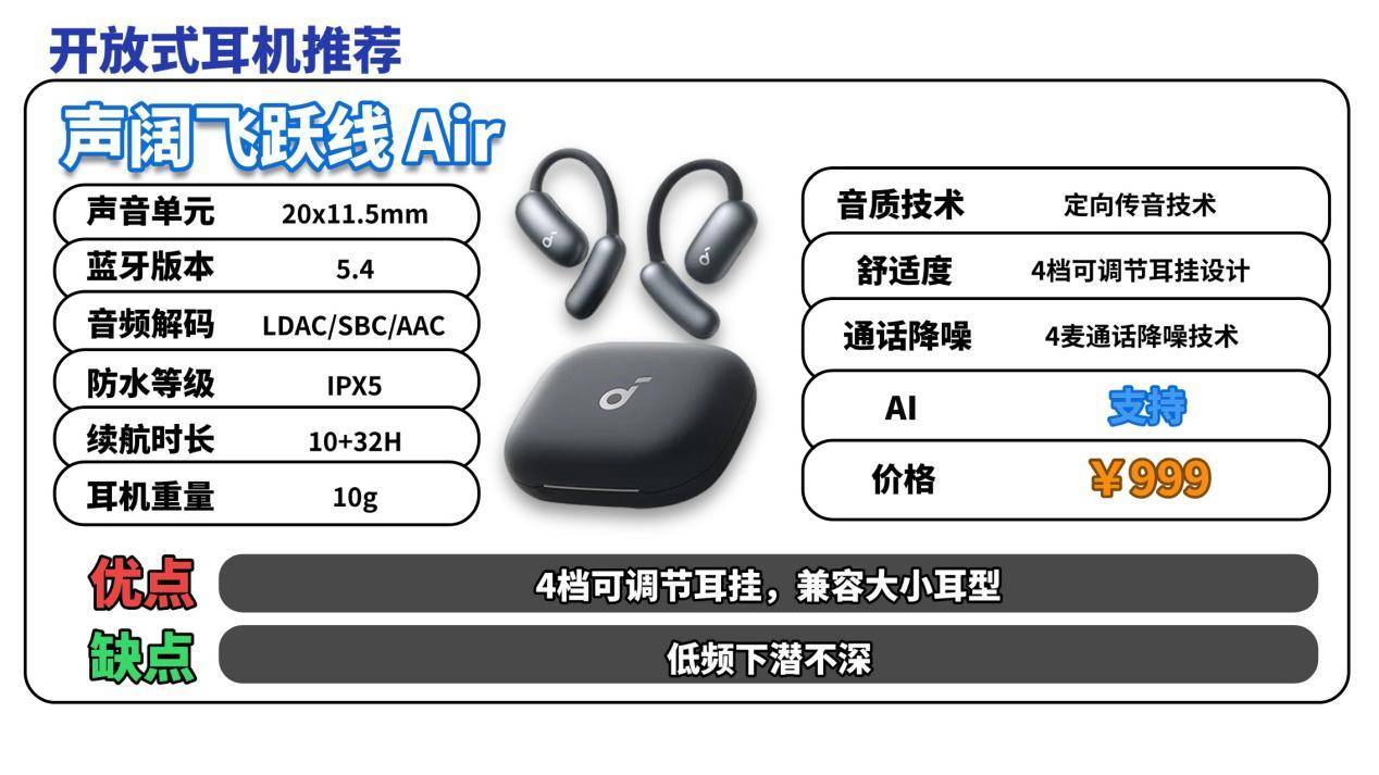其他方面:音质方面配备C leer DBE4.0低音增强技术+Xtensa HIFI 4高性能音频处理单元,提升对音频的动态调节,增强低频下潜能力,实现对低频声波的精准控制。同时搭载全新的高通骁龙S3音频平台,双麦克风降噪带来清晰的语音通话。Cleer ARC 5搭载蓝牙5.4版本,做到信息传递更快、更保真。AI体感操纵2.0版本捕捉用户动作,让用户在忙碌时也能解放双手。续航方面,单次续航9h,配合充电仓可达36h,同时支持闪充模式。开放式耳机推荐三: 声 阔飞跃线Air(¥999)综合推荐指数:⭐⭐⭐⭐一句话推荐:定向传音3.0技术精准控制声波,支持电脑手机双设备连接核心优势:单只耳机重量为10g,配合softcore云狐耳挂,更好的兼容不同耳型。音质上配备定向传音3.0技术,控制声波精准进入耳道,搭配后腔泄气漏斗设计,能够精准控制减弱声波进入耳道,减少声音外泄。蓝牙5.4版本适配各种使用场景,同时满足手机电脑双设备连接。