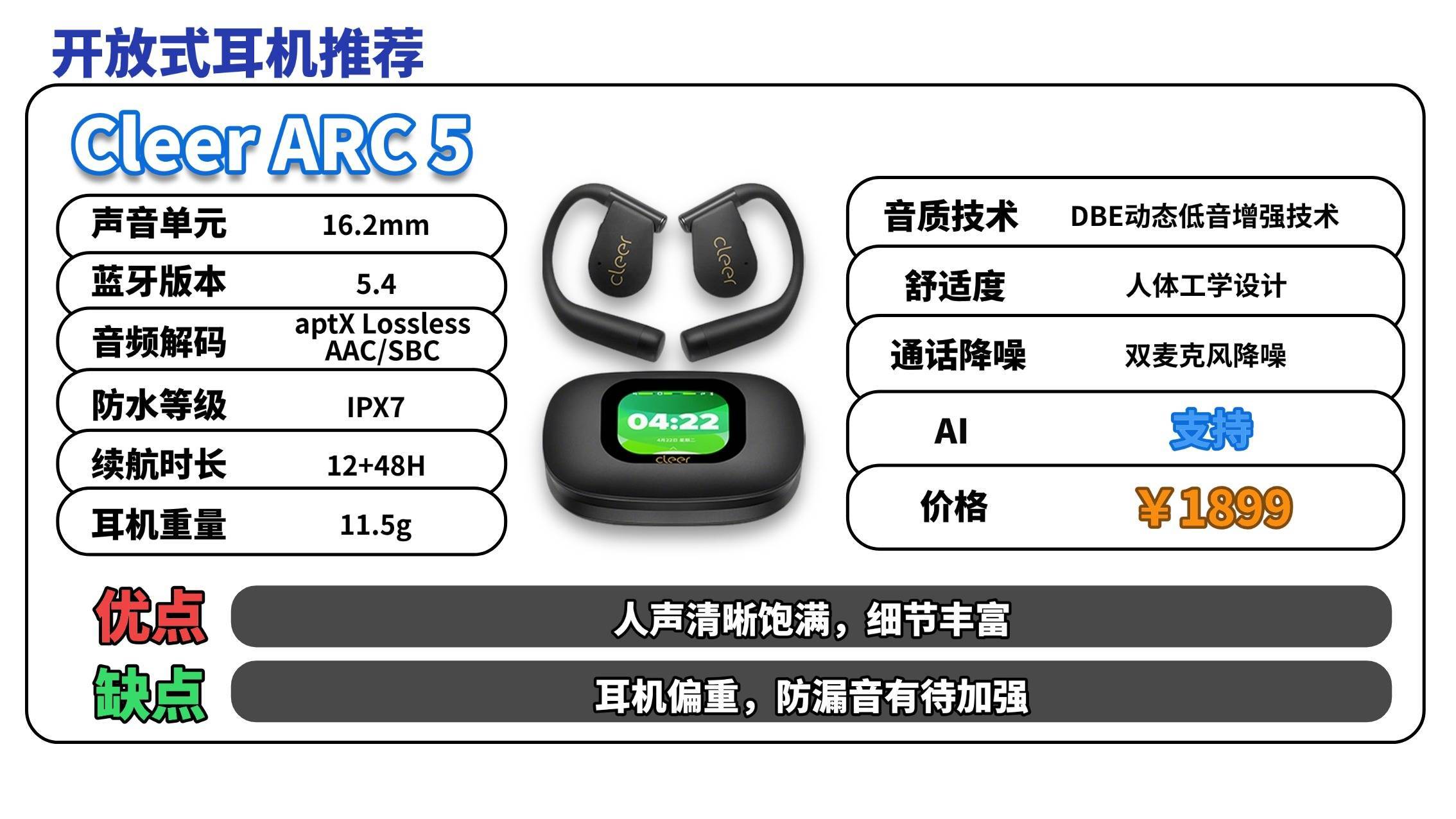为了带来极致的使用体验,南卡OE Mix2不仅搭载了高定制蓝牙5.4芯片SOC,性能更加强劲,抗干扰性更出色,实现了秒级连接和响应。还有着更高的数据传输速度、更低的能耗、更低的通信延迟。同时还配备了6+18H的长续航,双麦克风通话降噪、IPX5防水以及AI智能等多项功能,这个配置哪怕是放在千元机型上也是非常罕见的,可谓是诚意满满,性价比非常高!耳机每一个生产环节都经过精密设计和严格测试,以保证耳机能够承受各种外部压力和冲击,具备超强“抗衰减性”设计,让耳机使用两年的情况下音质性能衰减不到5%,显著提高了耳机的耐用性和可靠性。开放式耳机推荐二: C leer ARC 5(¥1899)综合推荐指数:⭐⭐⭐⭐一句话推荐:高性能音频处理单元增强低频下潜,AI体感操纵2.0解放双手核心优势:耳机采用亲肤硅胶材质,配合弹性仿生耳挂更加稳固舒适。Cleer DBE4.0低音增强技术+Xtensa HIFI 4高性能音频处理单元增强低频下潜,蓝牙5.4版本信息传输更快更保真,日常使用没有问题,AI体感操纵2.0运动时解放双手。