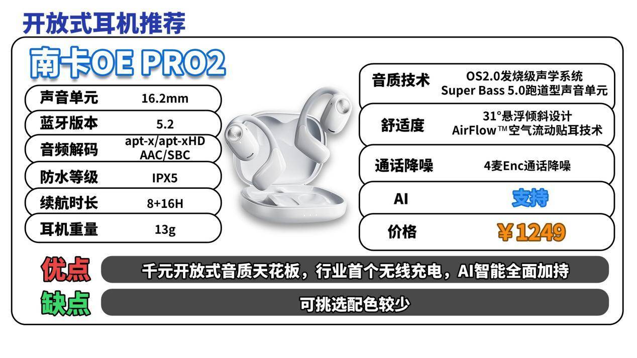 其他看点:音质方面,小米开放式耳机pro配备1813超大动圈声音单元,采用高分子复合振膜+内外双磁设计,低音表达更加澎湃。升级LHDC5.0,让音质无损输出,真实还原声音细节。此外,三种小米自研调音模式,提供更加多种曼妙的音感。搭载的独立防漏音系统,提升听音隐私性。配置方面,小米开放式耳机pro支持蓝牙5.4,支持独立录音和AI实时翻译功能,对于小米生态用户会比较友好。续航方面,单体耳机续航长达8.5h,搭配充电盒续航可达45h。开放式耳机推荐五: 南卡OE Pro2(¥1249)综合推荐指数:⭐⭐⭐⭐⭐一句话推荐:数码圈中高端口碑销量TOP1,开放式里的“音质巅峰”技术之王核心看点:南卡在开放式耳机领域的口碑与影响力已稳居行业顶尖,OE Pro2无论音质体验上还是ai体验上,都被公认为当前开放式耳机的Top1代表。它通过“软硬件协同”的独特设计理念,将智慧Ai与音质兼得,并依托南卡13年的声学技术沉淀,彻底突破了开放式耳机普遍存在的音质单薄、漏音严重等行业痛点。与此同时,OE Pro2还整合了全能AI智慧助手,能够满足翻译、对话、搜索、写作、创作等多样化场景需求。也正因如此,它不仅赢得了HiFi发烧友与运动达人的一致好评,更在开放式耳机圈内长期稳居第一梯队。