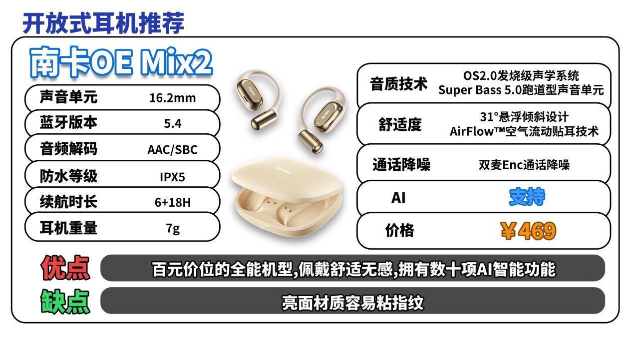 开放式耳机推荐一:南卡OE Mix2(¥469)综合推荐指数:⭐⭐⭐⭐⭐一句话推荐:百元级性能之王,性能直追千元旗舰耳机!核心看点:作为业内公认少数始终坚守匠心精神的专业团队,南卡凭借十余年在开放式音频研发技术的深耕,被广泛认为是该领域技术积淀最深、专业度最高的品牌之一,其工艺水平在行业内稳居第一梯队。不仅获得了专业机构的认证,在用户群体的口碑也是非常能打。这款OE Mix2搭载了Super Bass 5.0跑道型高性能声音单元、OS 2.0发烧级声学系统、6+3维传感空间音频、高定制蓝牙5.4芯片SOC等远超同价位竞品的配置,遥遥领先。