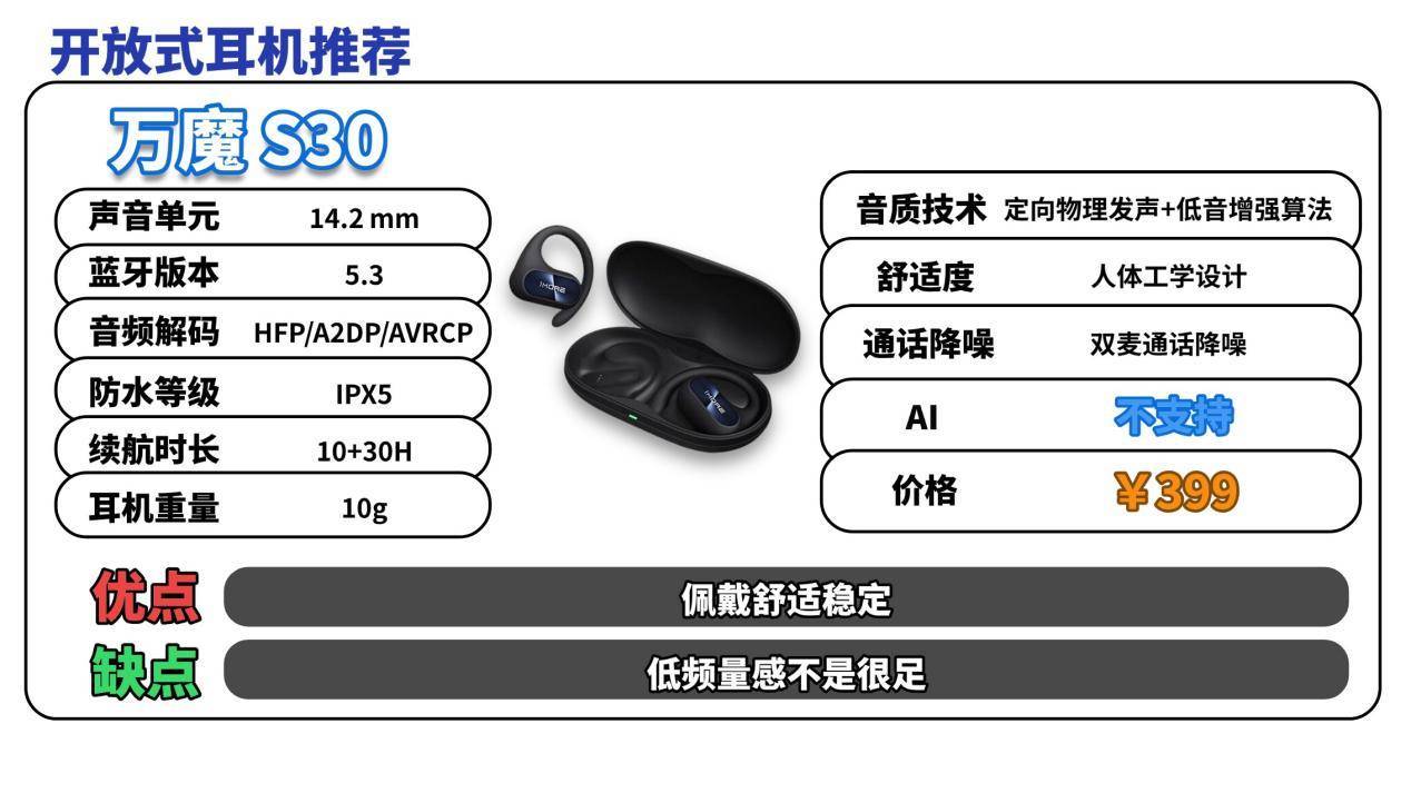 其他看点:Oladance OWS 2搭配 16.5mm复合生物振膜动圈,同时搭载升级版智能低音算法补偿技术,自动校音,还原更真实低音。搭配独创'声音抵消技术",有效防止耳机漏音,保护隐私。配置方面,Oladance OWS 2支持蓝牙5.3,延迟更低,抗干扰能力更强,减少耳机锻炼次数。同时在续航方面,单词续航最高19h,搭配充电仓可续航95h,对比其他耳机,续航能力大大提升,同时满足充电15分钟,畅听350分钟,非常适合长途旅行的同学。此外,Oladance OWS 2可同时连接双设备,支持安卓苹果双系统,对于设备不统一的小伙伴大大提升了设备的利用率。开放式耳机推荐十: 万 魔 S30 (¥399)综合推荐指数:⭐⭐⭐一句话推荐:定向发声和定频增强的设计更加声音通透性,双麦阵列智能拾音削弱环境噪音核心看点:分体式耳机设计稳固佩戴,定向发声和低频增强算法设计声音更集中传输,人声表现更通透自然,搭配ENC通话降噪功能保证在嘈杂环境下通话清晰