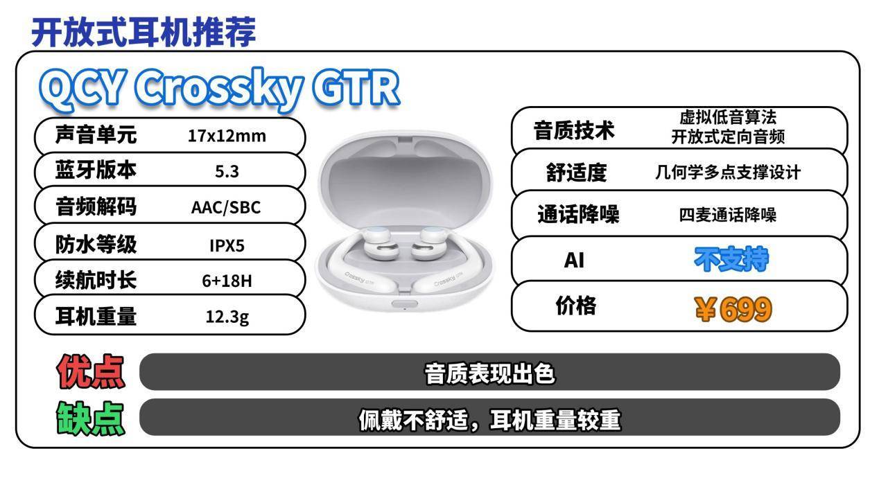 耳机搭载定制高通蓝牙芯片,支持更高解析度的Aptx无损音质传输,日常使用体验更为流畅,并且开启游戏模式可以达到60ms左右的低延时。支持ENC四麦通话降噪,有效解决了受环境影响大、出行飘音等痛点。续航上,南卡OE Pro2单次可使用高达8小时左右,整机使用更是可达25小时,日常使用绰绰有余。可以说在品核心的音质体验、佩戴舒适、链接体验等数据方面,在这个行业里都强到没边!开放式耳机推荐六: Q CY Crossky GTR(¥699)综合推荐指数:⭐⭐⭐一句话推荐:自研形态转轴满足不同耳形,大声音单元搭配虚拟低音保持澎湃低音核心看点:自研无人机形态转轴,满足不同耳形,结合几何学的支撑原理,分散耳背压力。搭载17X12mm声音单元,搭配虚拟低音算法,开放式定向音频技术,利用人听觉系统的特性,通过算法处理音质,保持澎湃听感。