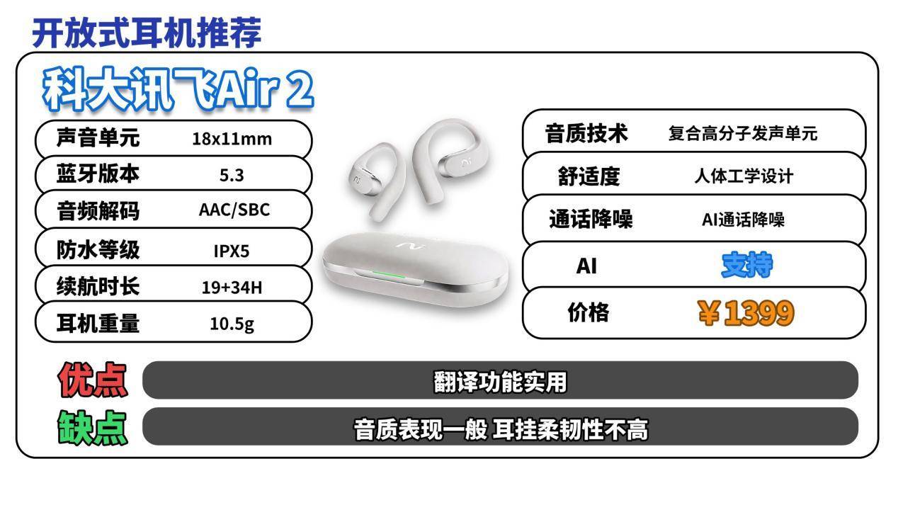 其他看点:搭载17X12mm声音单元,搭配虚拟低音算法,开放式定向音频技术,利用人听觉系统的特性,通过算法处理音质,保持澎湃听感。半米以外基本为无明显漏音情况,不用担心隐私泄露。支持蓝牙5.3,连接更加稳定、迅速,日常使用场景下延迟控制得当,而且能够与大部分设备兼容。另外,续航方面也还不错,待机时长210h,单次续航可听6h,搭配充点仓总续航可达24h开放式耳机推荐七: 科大 讯飞Air 2(¥1399)综合推荐指数:⭐⭐⭐一句话推荐:高分子跑道单元让声音更加层次分明,自研viaim AI办公更方便核心看点:亲肤液态硅胶,空气感贴合,耳机重量约为10g,日常佩戴基本没问题。搭配18X11高分子跑道单元,让声音响应快、振幅大,声音更加层次分明。自研viaim AI办公垂类大模式,录音转写、翻译交流等功能,大大提高工作效率。